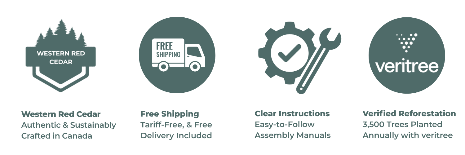 Every structure we craft supports local forestry, skilled manufacturing, and good-paying Canadian & American jobs, helping sustain the communities that make our shared North American economy strong. Choosing real Western Red Cedar over imitation products from overseas means investing in quality you can trust, while supporting responsible forest stewardship and homegrown craftsmanship.